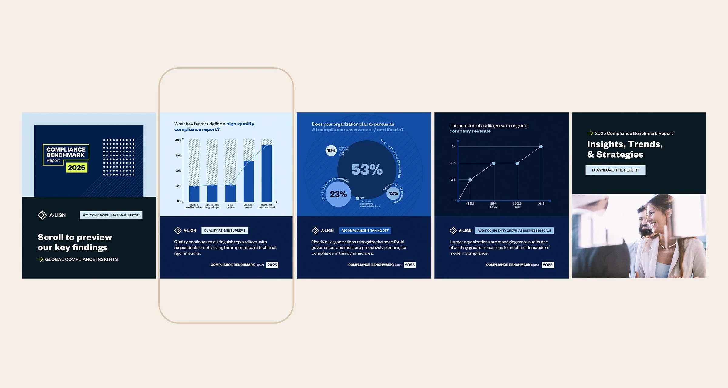 Led design for A-LIGN's 2025 Compliance Benchmark Report, leveling up from previous years with more sophisticated data visualizations and our refreshed brand identity. Transformed survey insights from hundreds of compliance professionals into clear, compelling charts covering auditor quality, AI concerns, and tech adoption trends. Built out the full promotional campaign—report design, LinkedIn ads, social content, and web assets—showing how thoughtful design turns dense research into engaging thought leadership.